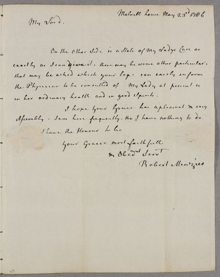 [ID:2821] From: Dr Robert Menzies (of Dura ) / To: Earl David Leslie (Earl of Leven & Melville, Lord Leven) / Regarding: Countess Wilhelmina Leslie (Nisbet) (Countess of Leven & Melville, Lady Leven) (Patient) / 23 May 1786 / (Misc)