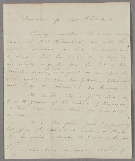 Directions for Captain Wedderburn, by Cullen and D. Rutherford. Date on annotation is 1789. Letter written by Rutherford (compared handwriting with letter 2978).