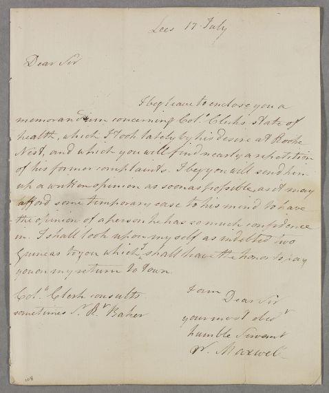 | Summary | Letter from Col. William Maxwell, concerning the case of Colonel Clerk (his uncle), whom he visited at Rook's Nest. It consists of a covering letter and a brief memorandum. He will pay him when he is next in Edinburgh. (He is currently staying at Lees, the home of the Marjoribanks family). |