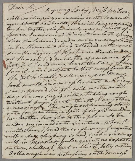 | Summary | Letter from Charles Brown, concerning the case of Miss Wilson, who 'will wait upon you in a day or two to consult you about her health'. Her mother was formerly a patient of Cullen's. |