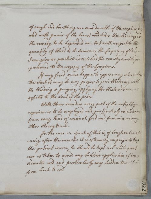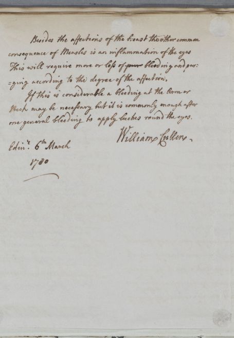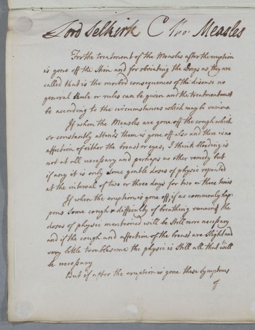 Letter for Lord Selkirk giving directions on treatment of measles giving general advice on how to manage possible after-effects, such as cough and respiratory problems, or eye inflammation. Could have been sent to Selkirk either at his Edinburgh home (where he was Cullen's neighbour), or at the family seat of St Mary's Isle, Kirkudbright.