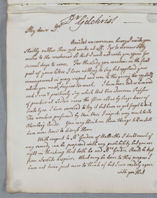 | Summary | Reply, 'Dr Gilchrist'. Cullen does not have any further recommendations for the female patient Gilchrist describes, but mentions a possible cure for fluor albus of Professor Van Doeveren in Leiden; also mentions Mr Gordon of Halleaths. |