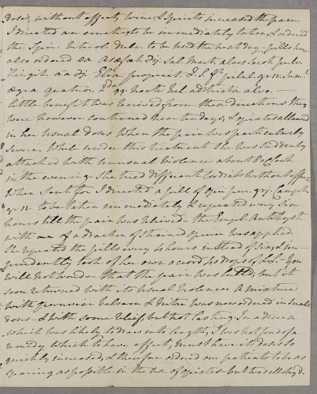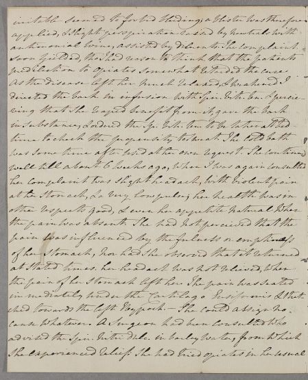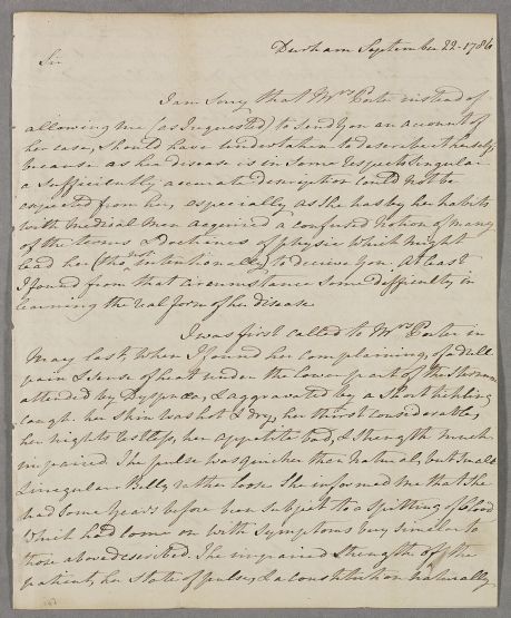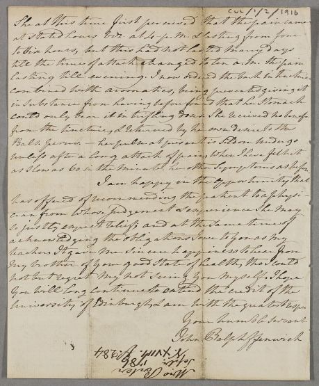 | Summary | Letter from John Ralph Fenwick, a former student of Cullen, concerning the case of Mrs Porter. He writes that he had asked her not to write herself as her case was 'in some respects singular' and that she has 'by her habits with medical men acquired a confused notion of many of the terms & doctrines of physic', but notes that she had written anyway. In outlining his treatment of her, he also warns that she has not always followed instructions with medication, and that her 'predilection to opiates somewhat retarded the cure'. |