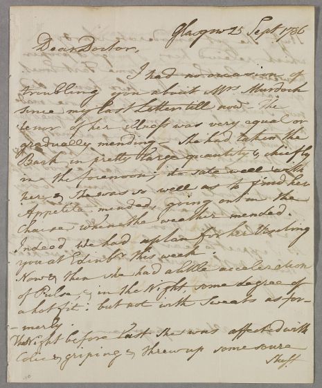 [ID:2885] From: Dr Alexander Stevenson (Professor; of Dalgairn ) / To: Dr William Cullen (Professor Cullen) / Regarding: Mrs Amelia Murdoch (Campbell) (Patient), Captain Cathcart (Patient), Mr Hunter (Patient) / 25 September 1786 / (Incoming)