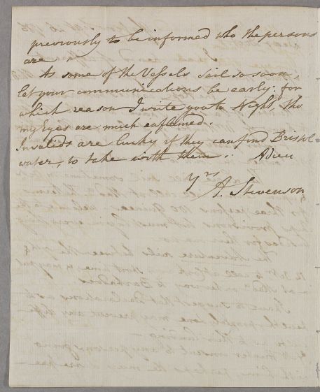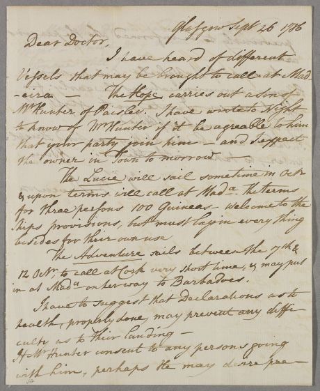 | Summary | Letter from A. Stevenson, listing ships he knows of that will be calling at Madeira. The son of Mr Hunter of Paisley will be travelling on, one, the Hope, and he will ask if it would be 'agreeable to him that your party join him'. Mentions a patient, a Mrs Murdoch in a postscript. Illegible handstamp. |
