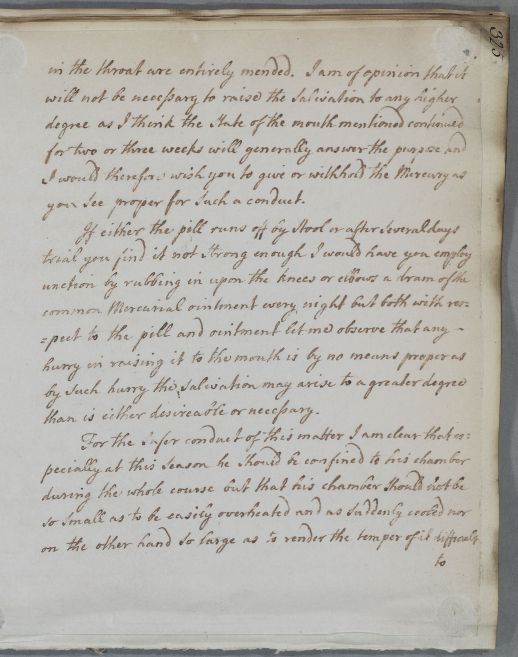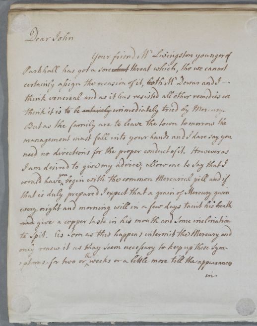 Case of Mr Livingston, the younger, of Parkhall, whose sore throat is considered venereal and is being treated with a mercurial course. |