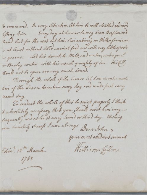 | Summary | Reply [to John Andrews] describing 'your friend, Mr Livingstone younger of Parkhall' who has a sore throat Cullen believes venereal, and handing his case to the addressee as the patient and his family are to leave the town. |