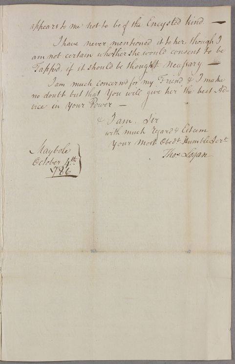 | Summary | Letter from Thomas Logan concerning the case of his cousin, Miss Binning. This letter is neatly written when compared with others by Logan. |