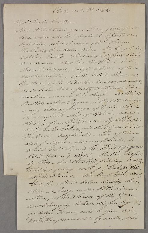 Letter from an unidentified correspondant, concerning the case of Mrs Fraser. The author details the dismal conditions of the ship in which Mrs Fraser travelled. The signature has been partially removed, making the author difficult to identify. The author seems to be an acquaintance of both Cullen and 'Hunter': 'Our fellow Voyager Hunter is much better in all respects - Stronger - & his Pulse reduced from 112 - to 80.' The 'Hunter' referred to could be John Hunter, a young student of Glasgow College and the son of Robert Hunter, who travelled to Madeira in attempt to combat a chest infection. (See Case ID:1940). The author also expresses affectionate compliments to all at Mint and Ormiston.