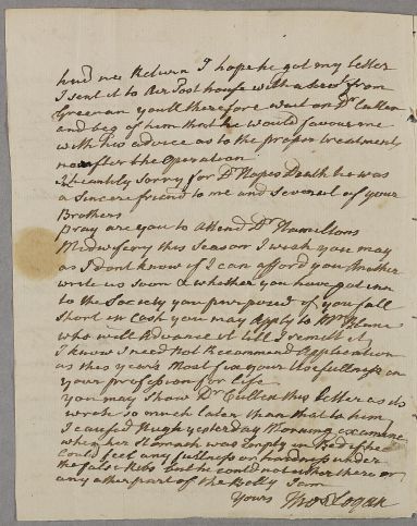 | Summary | Letter from Thomas Logan, concerning the case of Miss Betty Binning. This letter was originally sent by Thomas Logan to his son Willie, concerning Miss Betty Binning, which was later passed onto Cullen. |