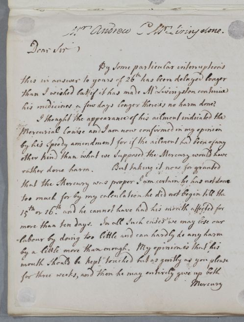 Case of Mr Livingston, the younger, of Parkhall, whose sore throat is considered venereal and is being treated with a mercurial course. |