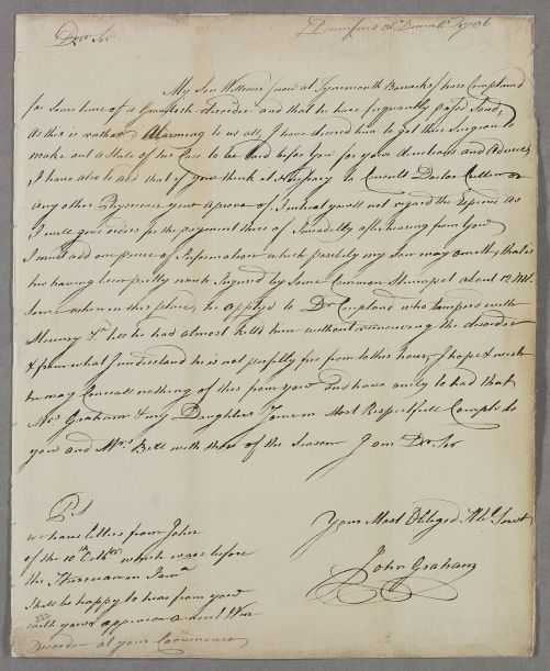 | Summary | Letter from John Graham to Benjamin Bell, concerning the case of his son, Captain William Graham, at Tynemouth Barracks, and suggesting consulting Cullen. He writes, "I must add one piece of Information which posibily my Son may omitt, that is his having been pretty much Injurd by Some Common Strumpet about 12 Mos. since" at home in Dumfries. In the postcript, he mentions having received letter from John (a Graham or a Bell?) before the hurricane in Jamaica. |