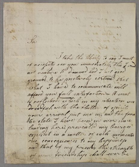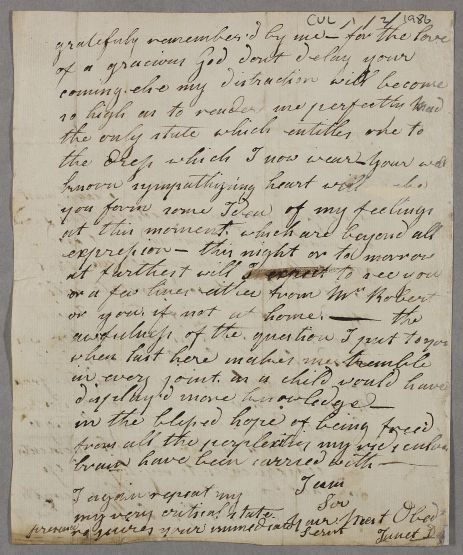 | Summary | Letter from Janet D., concerning her own case. She tells Cullen that she 'must of necessity see you immediately'. Dating based entirely on location in box with no textual support. Has been compared with letters from Janet in Case 1156, and probably the same person. Inferred that this letter is late Dec 1786. There is no mention of in Cullen's letter 5376 of the 28 Dec in reply to Robert Wood (letter 2948 of 24 Dec) about Janet's increasing anxiety, as shown by her writing in this letter, and there is no mention of medicine in her letter, which suggests it may have been written after the 24th and Cullen didn't receive it until after the 28th. |