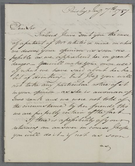 | Summary | Letter from William Farquharson, concerning the case of an unnamed woman of rank with a drink problem at Paisley. Enclosed case note is next item in the case sequence. |