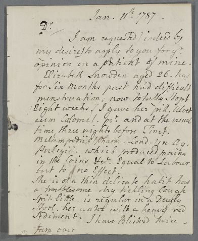 Case of Miss Elizabeth Snowden who has a menstrual disorder and grows weaker with other complications. |