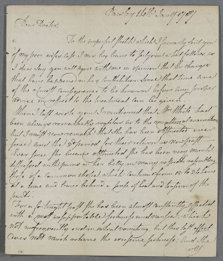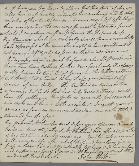 | Summary | Letter from John White concerning the case of his wife, Mrs White, sent in addition to 'the imperfect sketch which I formerly sent you'. |