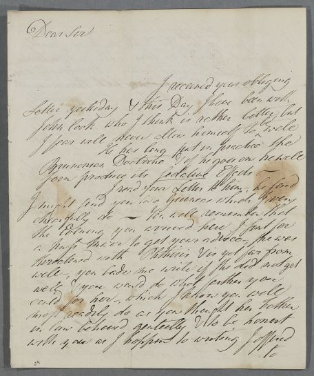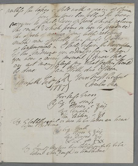 | Summary | Letter from Charles Keith, concerning the cases of John Cook, who 'is rather better, but I fear will never allow himself to be well', and of Miss Marr, who has been 'threatened with Phthisis & is yet far from well'. He includes copies of the medicines he has been prescribing for Miss Marr. |