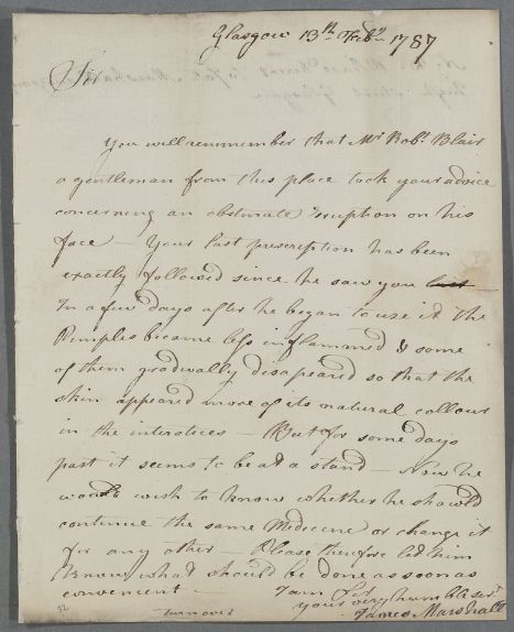 | Summary | Letter from James Marshall, concerning the case of Robert Blair, who 'took your advice concerning an obstinate Eruption on his face'. |
