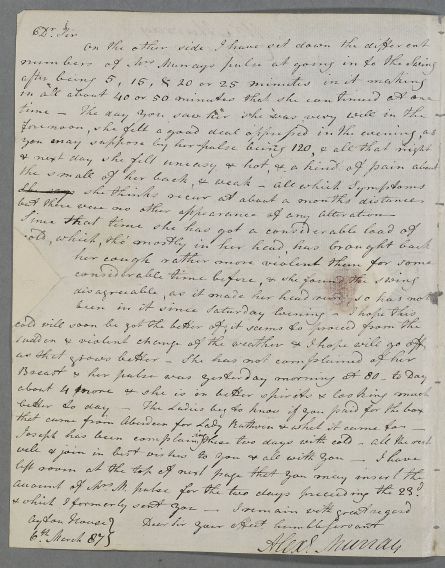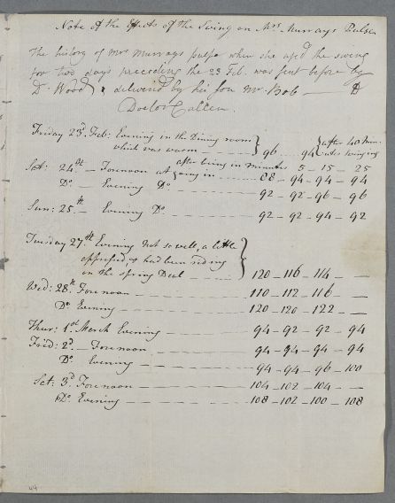 | Summary | Letter from Alexander Murray, concerning the case of Mrs Murray. He gives details of her pulse while using the swing over two days. |