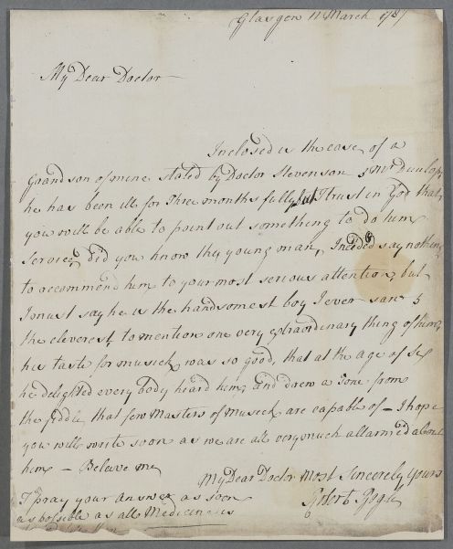 | Summary | Letter from Robert Bogle, concerning the case of his grandson, 'the handsomest boy I ever saw and the cleverest'. He mentions an enclosed case note on the boy by Dr Stevenson and Mr Dunlop, now Document 3010. |