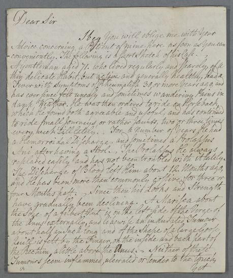 Letter from John Mudie concerning the case of an unnamed gentleman in Montrose, aged 71, 'who lived regularly and sparely'. He had a fever with acute rheumatic symptoms 30 years ago, and more recently has suffered from piles and anal prolapse. Mudie is now treating him for pain in the hypochondrium and rectal tumours.