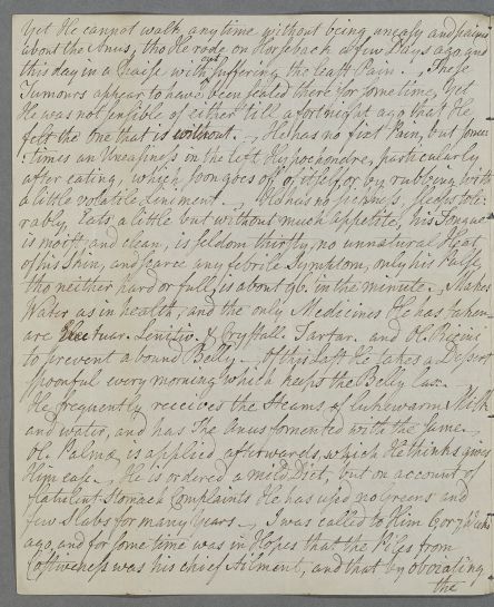 | Summary | Letter from John Mudie concerning the case of an unnamed gentleman in Montrose, aged 71, 'who lived regularly and sparely'. He had a fever with acute rheumatic symptoms 30 years ago, and more recently has suffered from piles and anal prolapse. Mudie is now treating him for pain in the hypochondrium and rectal tumours. |