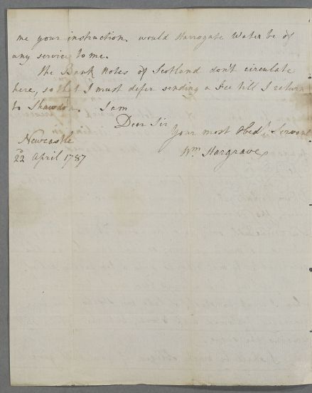| Summary | Letter from William Hargrave, concerning his own case: "the Bank Notes of Scotland don't circulate here [Newcastle], so that I must defer sending a fee till I return to Shawdon'. |