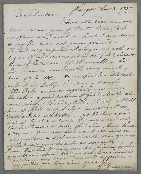 | Summary | Letter from A. Stevenson on the case of 'little Clark', the son of Mr Clark and grandson of Mr Bogle. |