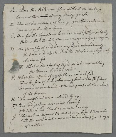 Unsigned list of questions for a male patient [General Campbell] suffering from biliousness who has been 'on the continent' but was also treated with the bark in the West Indies. Identified by transcriber as relating directly to Document:3366, which gives Cullen's fuller responses. Conjectural date of May 1787 changed accordingly.