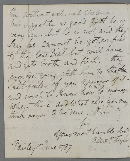 | Summary | Letter from Alexander Taylor, concerning the case of the son of Mr McArthur, whose case is not improving. |