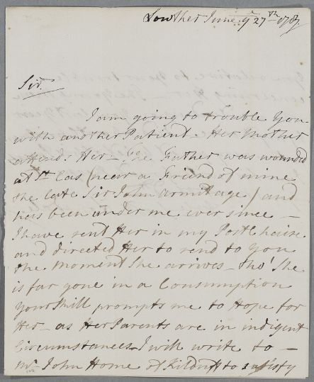 Letter from Lord Lonsdale concerning the case of Miss Brodie, who will be visiting Cullen with her mother. Her parents are 'in indigent circumstances' father was wounded at St Cas 'near a friend of mine the late Sir John Armitage'. Lonsdale also refers to a "young man who waited upon you last year by my Desire - died about Christmas" [Case 2011 John Home of Kildness].