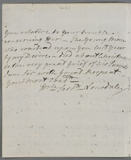 | Summary | Letter from Lord Lonsdale concerning the case of Miss Brodie, who will be visiting Cullen with her mother. Her parents are 'in indigent circumstances' father was wounded at St Cas 'near a friend of mine the late Sir John Armitage'. Lonsdale also refers to a "young man who waited upon you last year by my Desire - died about Christmas" [Case 2011 John Home of Kildness]. |