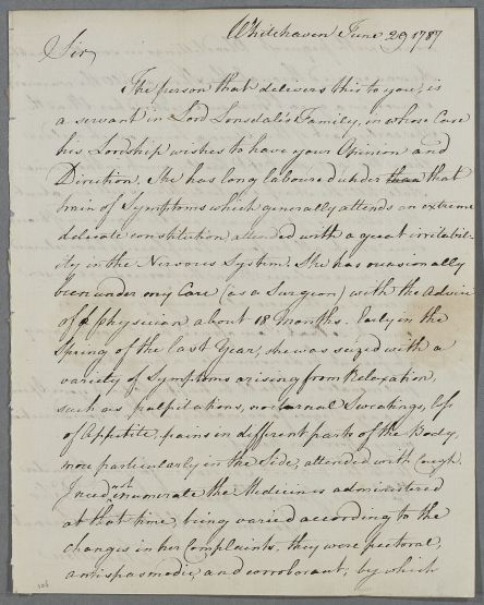 Case of Miss Brodie, 'a servant in Lord Lonsdale's Family', who is 'far gone in consumption'. |