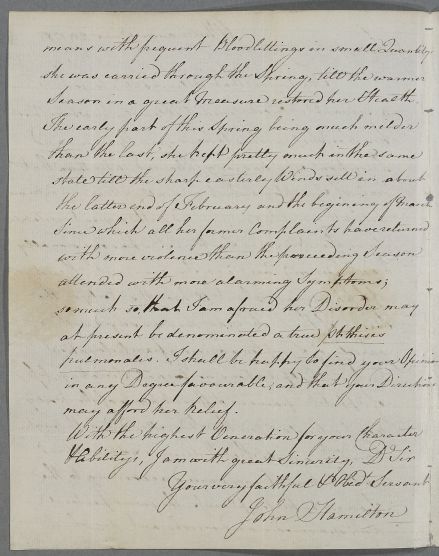 | Summary | Letter from John Hamilton concerning the case of Miss Brodie, 'a servant in Lord Lonsdale's Family'. |