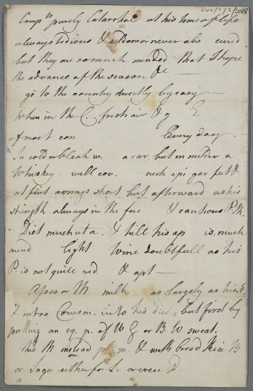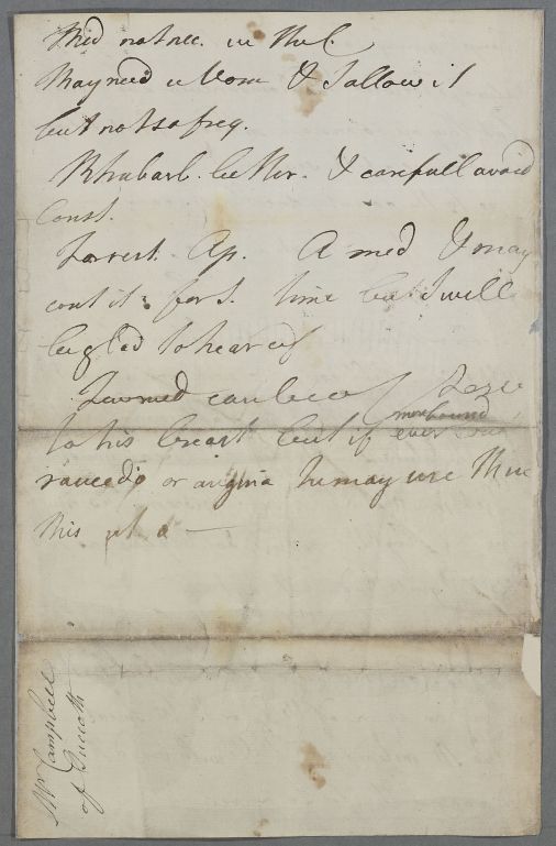 | Summary | Reply, in the form of a retained authorial draft, for 'Mr Campbell of Succoth'. Cullen regards his complaints as 'purely Catarrhal', and advises on exercise and diet. A mucilage may be prescribed if he does not suffer 'raucedo' (hoarseness) or angina. The symptoms are not those for which Archibald Campbell of Succoth consulted Cullen in 1787, so the identification of the patient – only given in the annotation – and the date remain tentative. |
