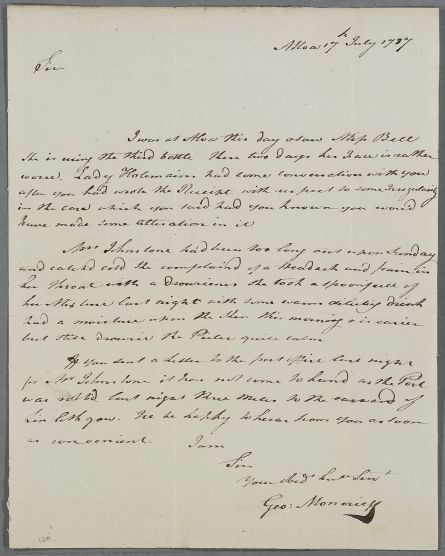 | Summary | Letter from George Moncrieff, concerning the cases of Miss Bell, about whom Cullen had spoken with Lady Holemain (Holmains), and Mrs Johnstone. |
