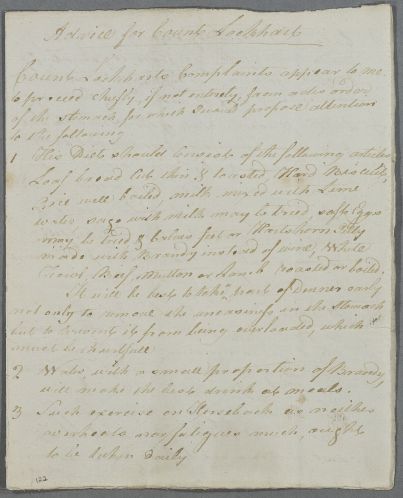Case of Miss Lockhart (assumed to be the daughter of Count Lockhart) who is advised to take whey and other matters of regimen for an unspecified condition. Poor copies hinder establishing full details. |