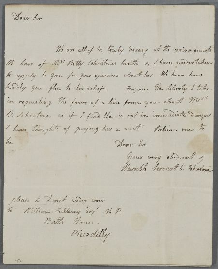 | Summary | Letter from C. Johnstone (probably George Johnstone's widow, Deborah Charlotte, known as Charlotte), concerning the case of her sister-in-law, Betty Johnstone. The family is concerned about her health, and the writer, who asks Cullen to reply c/o Betty's brother William (Johnstone) Pulteney at Bath House, Piccadilly, says that she hopes to visit her if "she is not in immediate danger". |