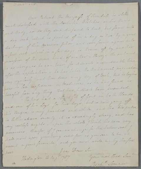 Case of George Hay, Marquis of Tweeddale who has gout; in 1787, the last year of his life, he also suffers from 'Scorbutic Blotches on his arms and body'. |