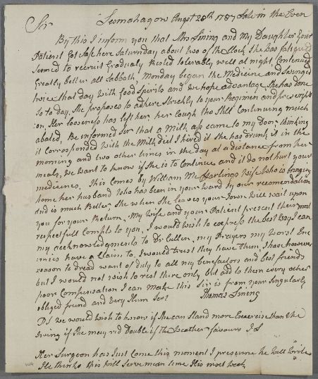 [ID:3210] From: Mr Thomas Lining (Linning) / To: Dr William Cullen (Professor Cullen) / Regarding: Miss Lining (Patient), Mr William McFarling (Patient) / 28 August 1787 / (Incoming)