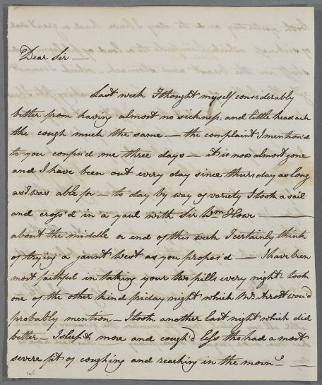 | Summary | Letter from 'M. E. H.' (Magdalane Elizabeth 'Maddy' Hamilton) on her own case. She mentions crossing in a yawl with Sir William Howe. She has been taking pills prescribed by Cullen and James Arrott. She suffers from cough and retching: 'I have had a great deal of sickness which I impute to a load of phlegm and stuff in the breast and stomach '. |