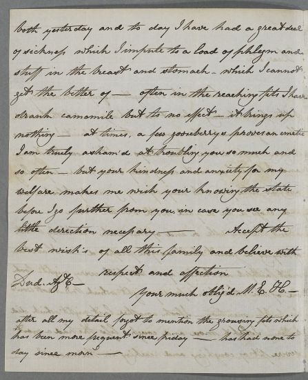Letter from 'M. E. H.' (Magdalane Elizabeth 'Maddy' Hamilton) on her own case. She mentions crossing in a yawl with Sir William Howe. She has been taking pills prescribed by Cullen and James Arrott. She suffers from cough and retching: 'I have had a great deal of sickness which I impute to a load of phlegm and stuff in the breast and stomach '.