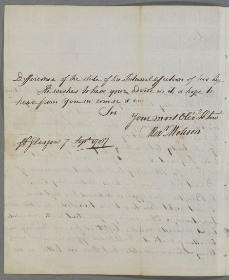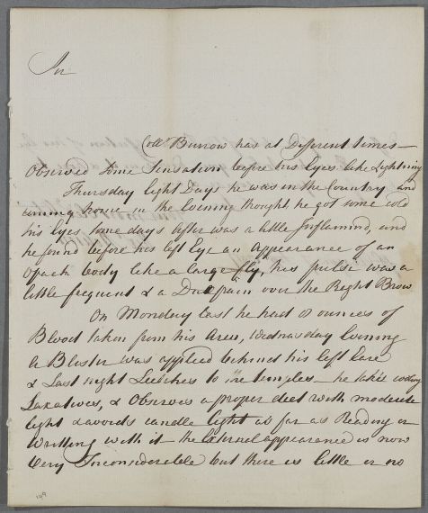 | Summary | Letter from Alexander Molison, concerning the case of Collector Burrow, who 'has at Different times observed some sensation before his Eyes like Lightning' and an 'opack body like a large fly' in his left eye, after getting cold returning home from the country eight days ago. He has been bled, blistered and had leeches applied. There is some pen-practice on the cover. |