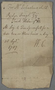 | Summary | Very short recipe 'For Mr Johnstons child', in Cullen's own hand. Probably sent directly to her father, as Cullen seems to correspond more often directly with him than through the local surgeon. |