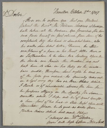 | Summary | Letter from John Jack concerning the case of Rev. Mr William Andrews of Woodsyde, who, having taken the prescribed medicines, 'finds himself in part relieved from some of his complaints'. However, he still has a sore throat, and 'Part of his head is still kept open with Issue Salve'. |