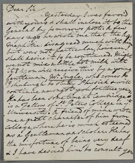 Letter from Charles Brown concerning the case of General Beckwith. Letter delivered by Mr Ingle, a Fellow of Peterhouse, Cambridge, whom Brown introduces to Cullen as a new student at Edinburgh. The young man is 'very deaf', so Brown has asked him also to consult Cullen about his hearing.