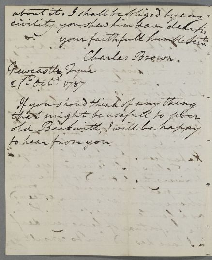 | Summary | Letter from Charles Brown concerning the case of General Beckwith. Letter delivered by Mr Ingle, a Fellow of Peterhouse, Cambridge, whom Brown introduces to Cullen as a new student at Edinburgh. The young man is 'very deaf', so Brown has asked him also to consult Cullen about his hearing. |