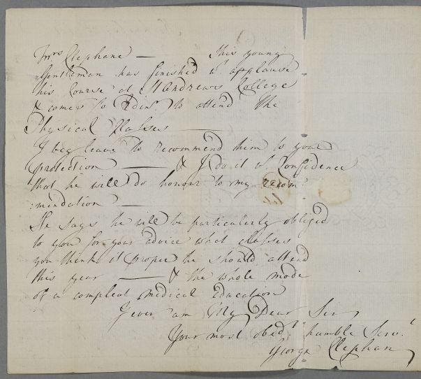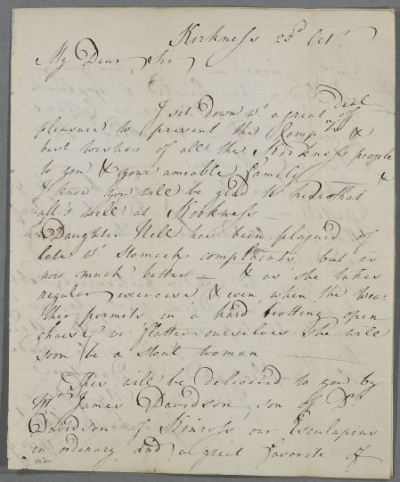 | Summary | Letter from George Clephan introducing James Davidson, son of Dr Davidson of Kirknes. He also mentions that his daughter Nell 'has been plagued of late w[ith] stomach complaints, but is now much better'. |