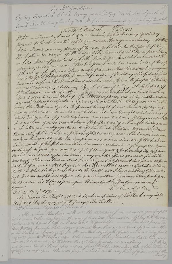 | Summary | Reply, 'For Mr Murdoch', concerning his wife. Cullen relates that Mrs Murdoch is in danger of phthisis, although as yet he 'cannot declare purulency or he[c]tic'. As she believes 'her ailment is very much about the top of the tongue', she must be humoured about this. Cullen sends a letter directly to her, open, to Stevenson, so that 'we might not differ about small matters'. In a postscript, he adds that since Mrs Murdoch complains of toothache, she should 'get quit of every spoild Tooth'. |