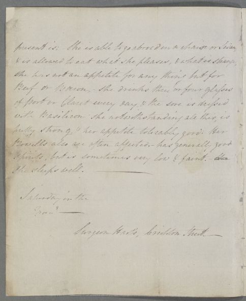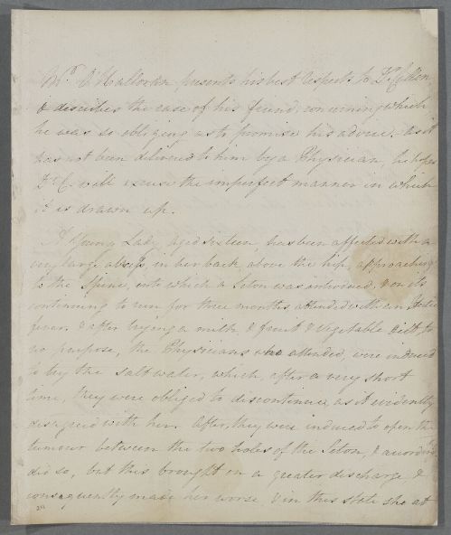 | Summary | Letter from Mr O'Halloran, concerning the case of an unnamed 16-year-old female 'friend' (probably a family member in Ireland). She has a large abscess on her back, above the hip and close to the spine. She had had a seton in it for 3 months, but now it has been opened, with considerable discharge. He describes her condition, and that the wound is dressed with Basilicon. |